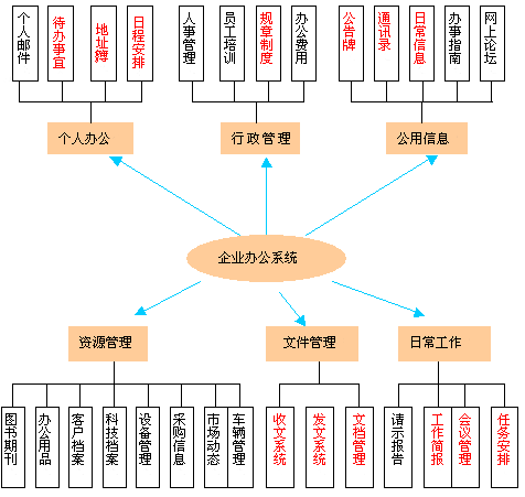 企業(yè)辦公系統(tǒng)的主要目標是實現(xiàn)企業(yè)辦公及事務管理,企業(yè)辦公效率、節(jié)約辦公經(jīng)費、創(chuàng)建企業(yè)文化。是辦公系統(tǒng)與管理信息系統(tǒng)的結(jié)合,系統(tǒng)有多個單獨模塊組成,體系結(jié)構(gòu)如下:
